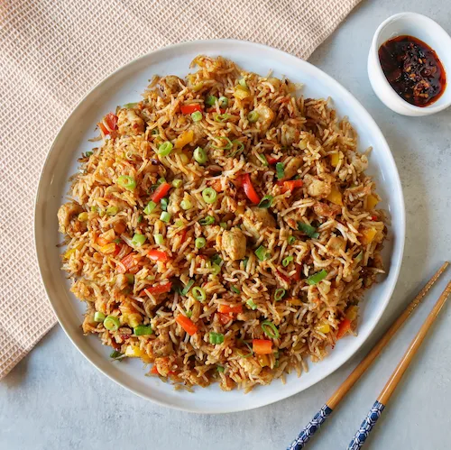 Spicy Schezwan style chicken fried rice or noodles.